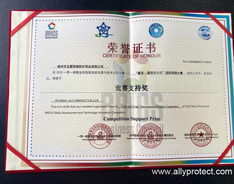 梧州市友盟焊接防護用品有限公司榮獲2020年一帶一路暨金磚國家技能發(fā)展與技術創(chuàng)新大賽競賽支持獎。AP友盟將不遺余力的支持國家一帶一路發(fā)展的宏偉戰(zhàn)略。